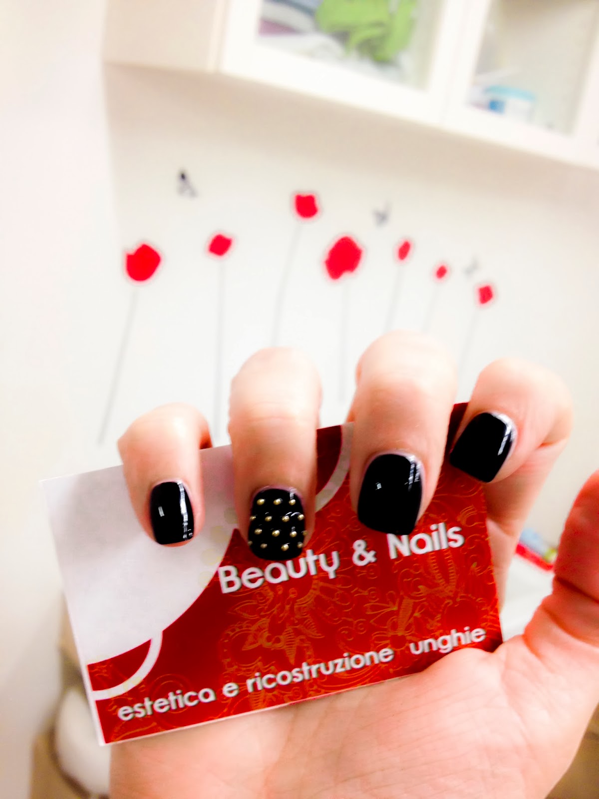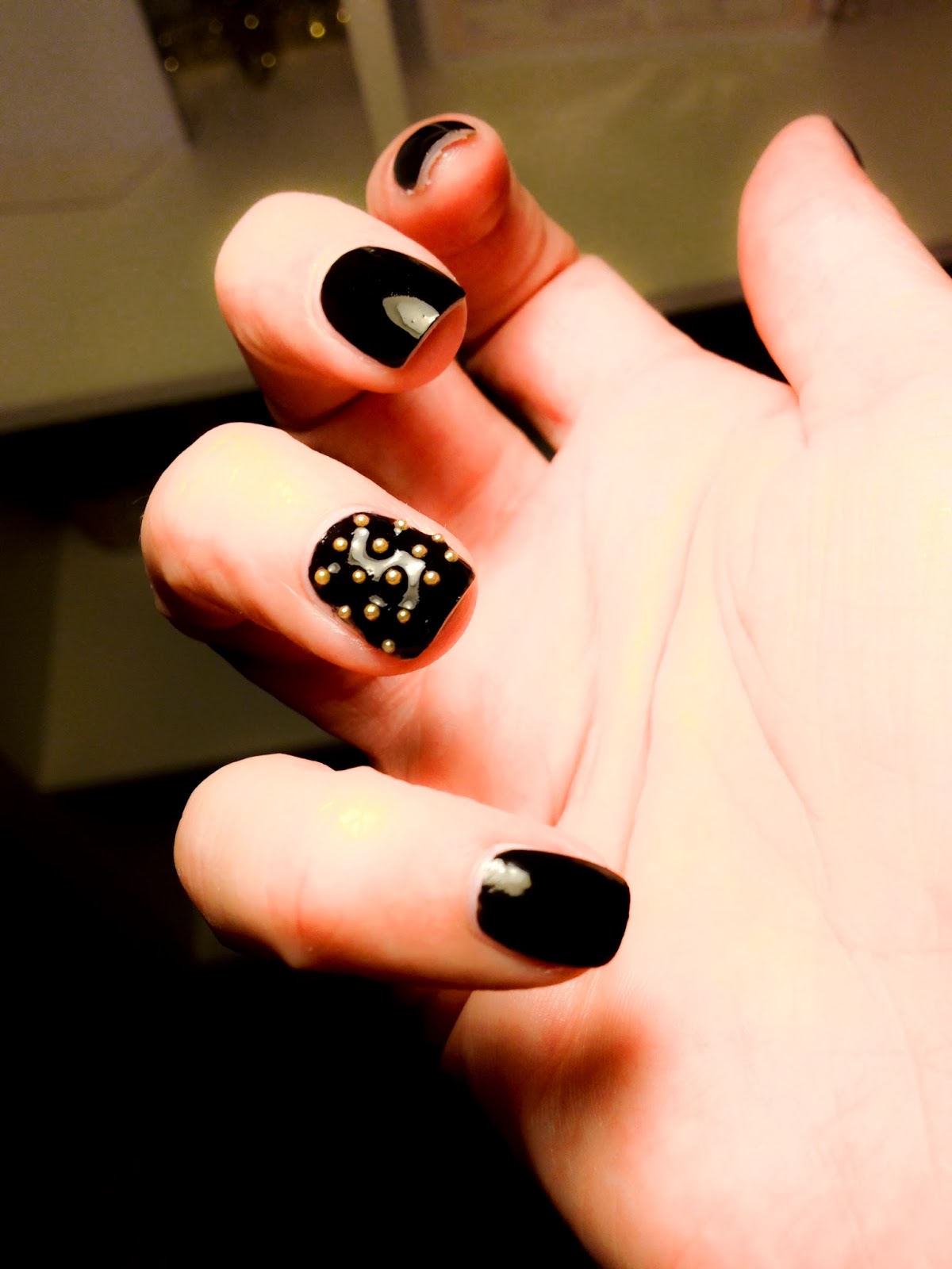 Virginia anche questa volta è riuscita a conquistarmi e a convincermi a dedicare ben due delle mie unghie ad un decoro un po' forte: le borchiette in oro sulla base di uno smalto nero!
