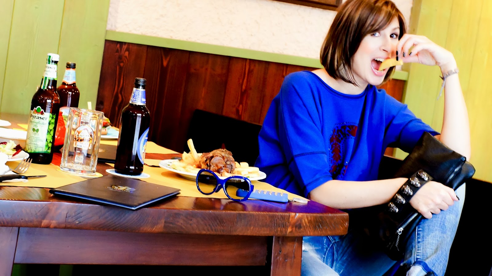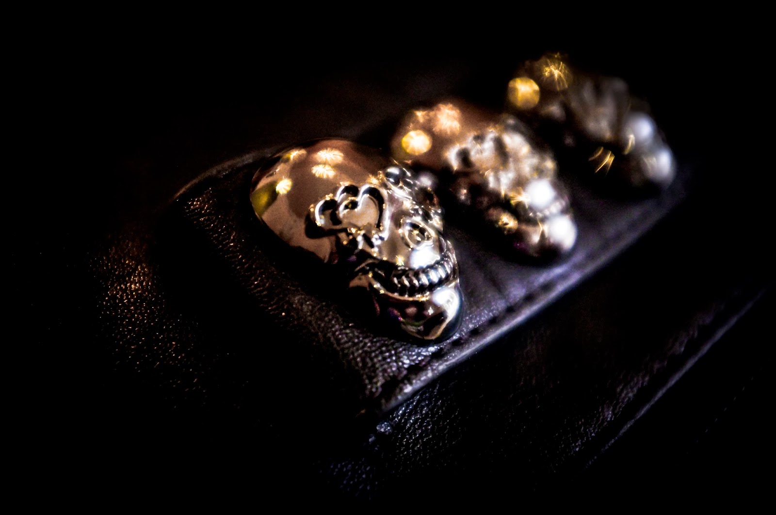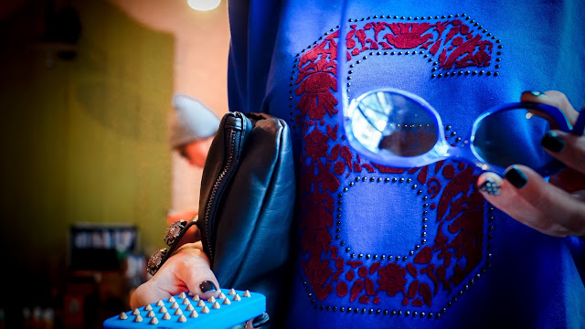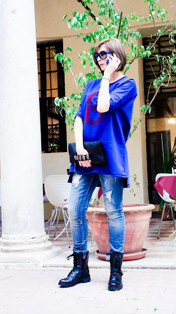 Jeans strappato, borchie sulle unghie, clutch con i teschi e anfibio!
