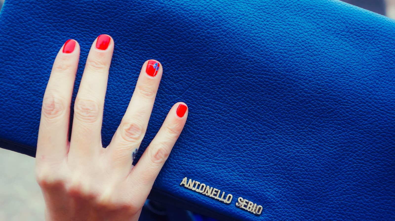 Le unghie rosse con un fiocchetto blu create da Virginia per il Natale