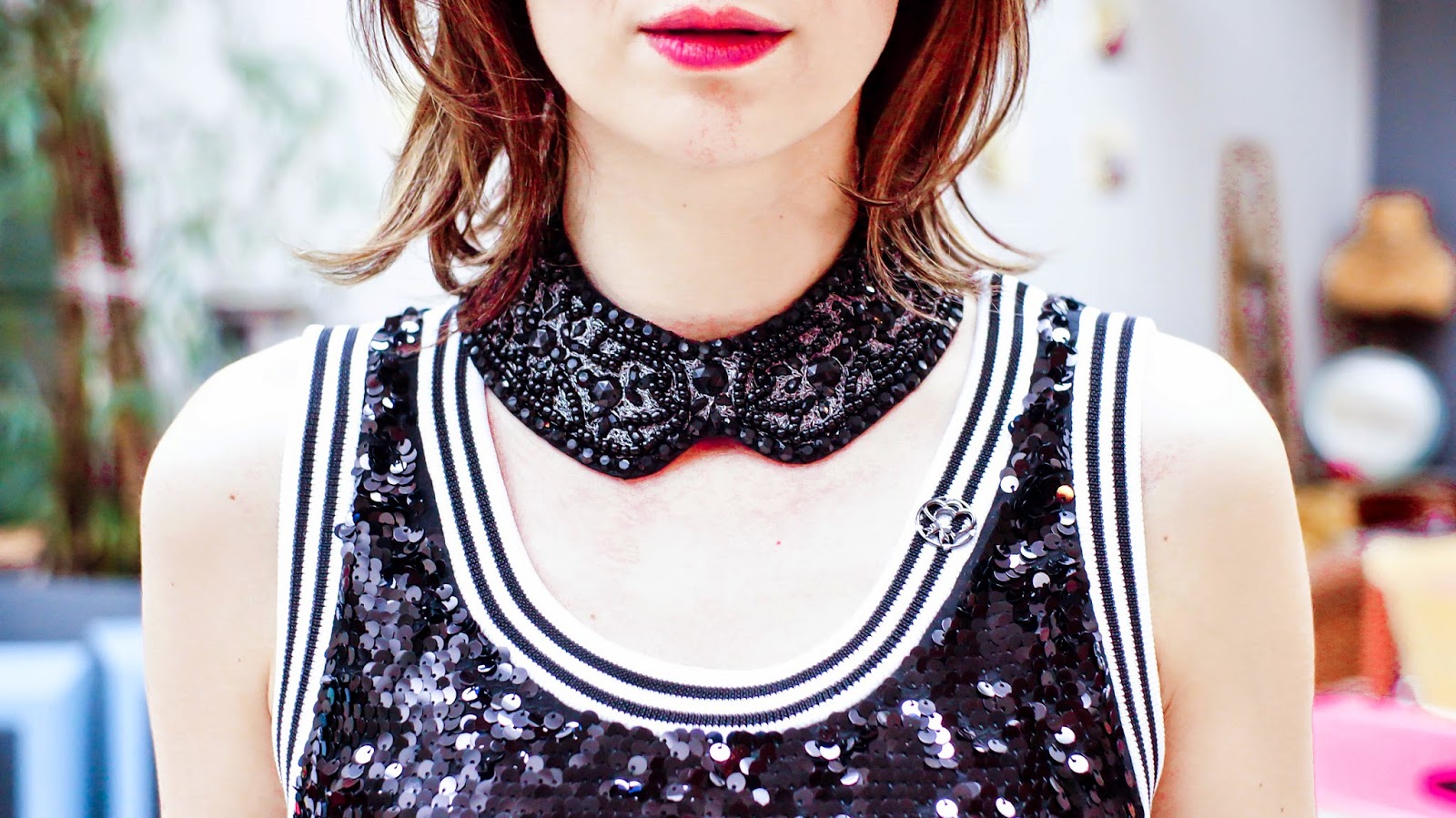 Adoro questa canotta di Maison Espin dall'animo sportivo (modello e finiture in bianco) e dai dettagli fashion come la frase che richiama Chanel e l'enorme cascata di paillettes nere.